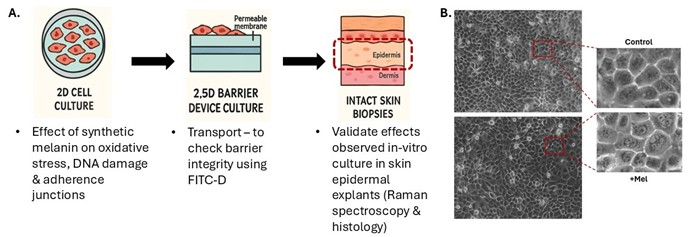A. Schematic illustrating the workflow of the study, moving from 2D skin models to human skin explants, and highlighting the role of synthetic melanin in modulating oxidative stress. B. Phase-contrast microscopy image showing the internalization of synthetic melanin in HaCaT cells.